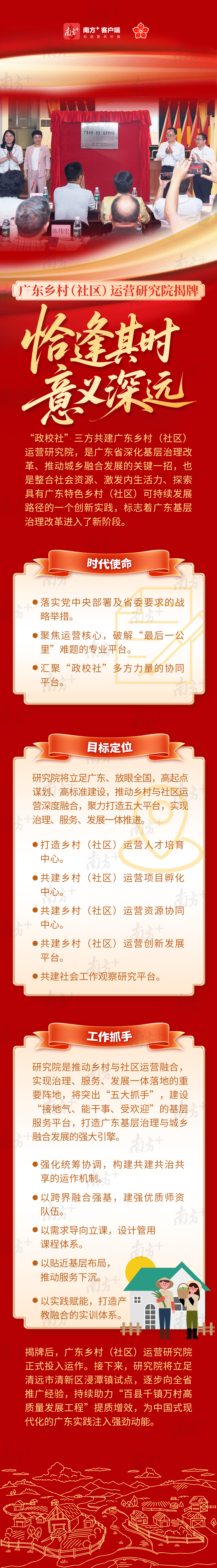 “我们期待,通过‘政、产、学、研、慈’深度融合模式,汇聚各方智慧与资源,形成推动乡村(社区)运营的强大合力,成为政、校、社协同发力的典范。”广东省委社会工作部部长、省委“两新”工委书记崔建军表示,广东乡村(社区)运营研究院要既有“党建味”,又要有“文化范”,聚力打造人才成长平台、资源集聚平台、能量注入平台,探索建立众筹式、合伙制的运作模式,重点开设入户连心、民意速办、村社运营等主题的精品课程,以文化润心、数字赋能推动乡村与社区运营深度融合,建设治理、服务、发展一体落地的重要阵地,成为“接地气、能干事、受欢迎”的基层服务平台。